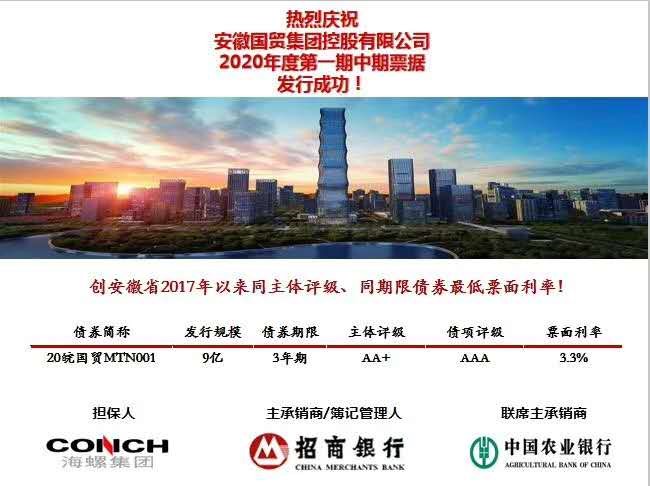 3月5日,國貿集團經過充分準備和籌劃,成功發行2020年度第一期中期票據,募集資金9億元,期限為3年,發行利率3.3%,創安徽省2017年以來同主體評級、同期限債券最低票面利率,也創造了國貿集團發債史上價格新低。