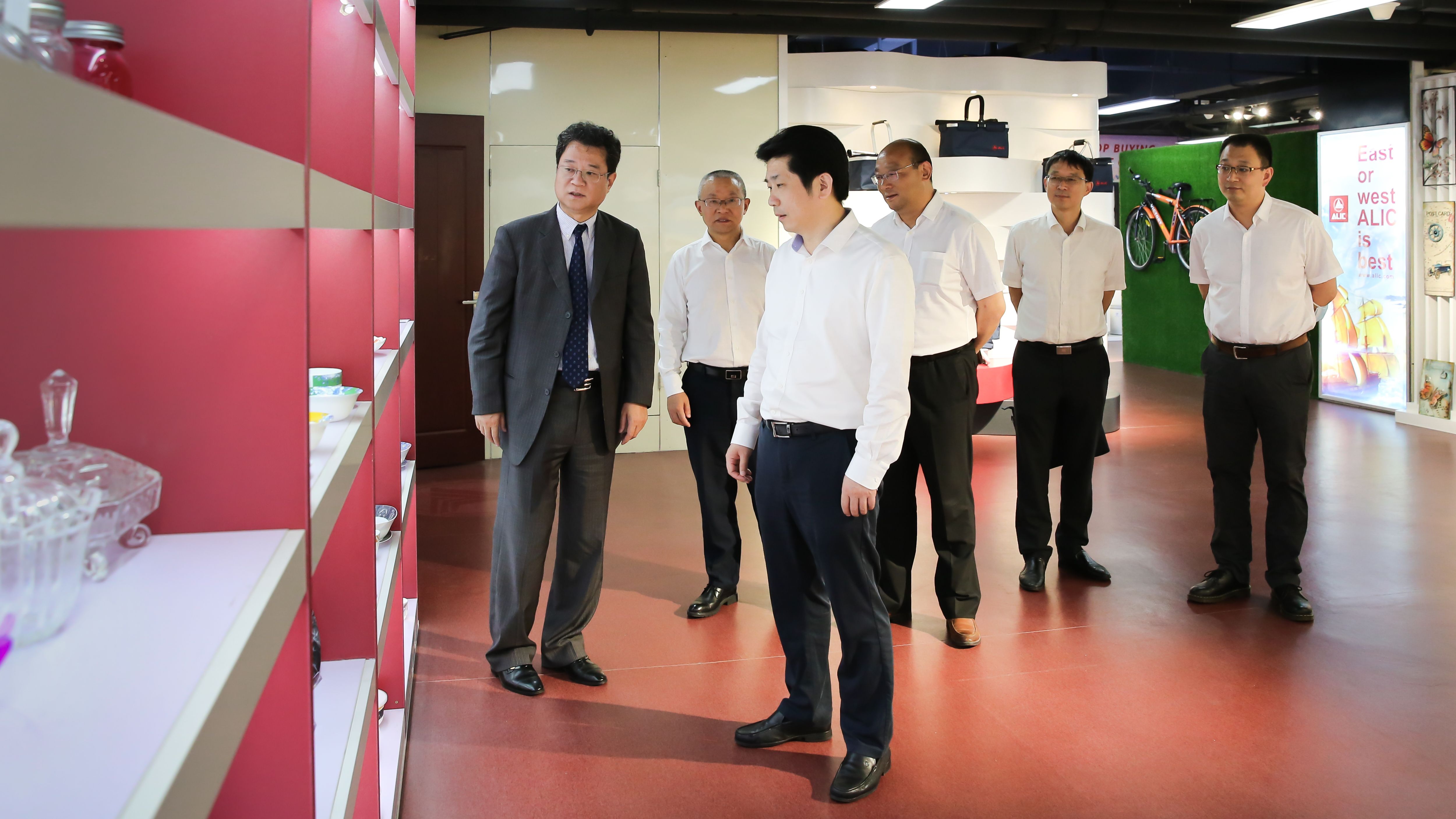調研期間,楊軍深入安徽國貿所屬輕工國際公司業務一線,現場查看了產品認證檢測中心、進出口商品展廳、黨員活動中心等,詳細了解了業務出運數據、服裝設計研發等有關情況。