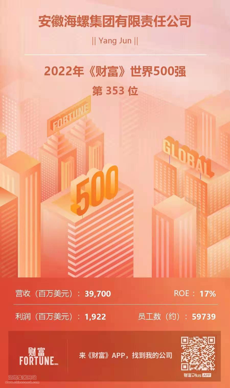 2022年8月3日,《財富》雜志公布“2022年世界500強企業”排名榜單,海螺集團以39,700百萬美元的營業收入位居第353位,連續4年進入世界500強。