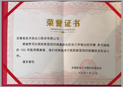 新冠肺炎疫情爆發以來,安徽醫科大學第四附屬醫院承擔著繁重的疫情防治任務。在聽聞該院急需各類防護物資的消息后,安徽技術公司黨委書記、董事長程峰在安排企業做好自身疫情防控工作的同時,廣泛動員力量,充分調動資源,克服困難緊急籌集了100件醫用隔離服捐助安醫四附院,為緩解該院醫護人員防護物資緊缺獻上一份綿薄之力。