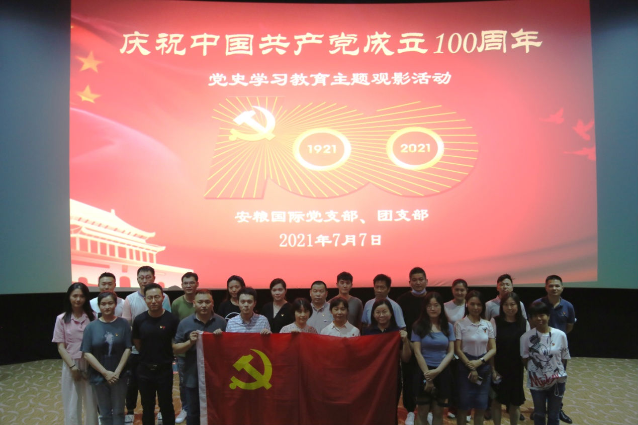 安糧國際黨支部組織全體黨員觀看愛國主義教育影片《1921》,深入了解諸多仁人志士前赴后繼傳播馬克思主義、創建中國共產黨的熱血故事,集體回憶和重溫中國共產黨的偉大誕生過程,激發了大家強烈的愛黨愛國之情。