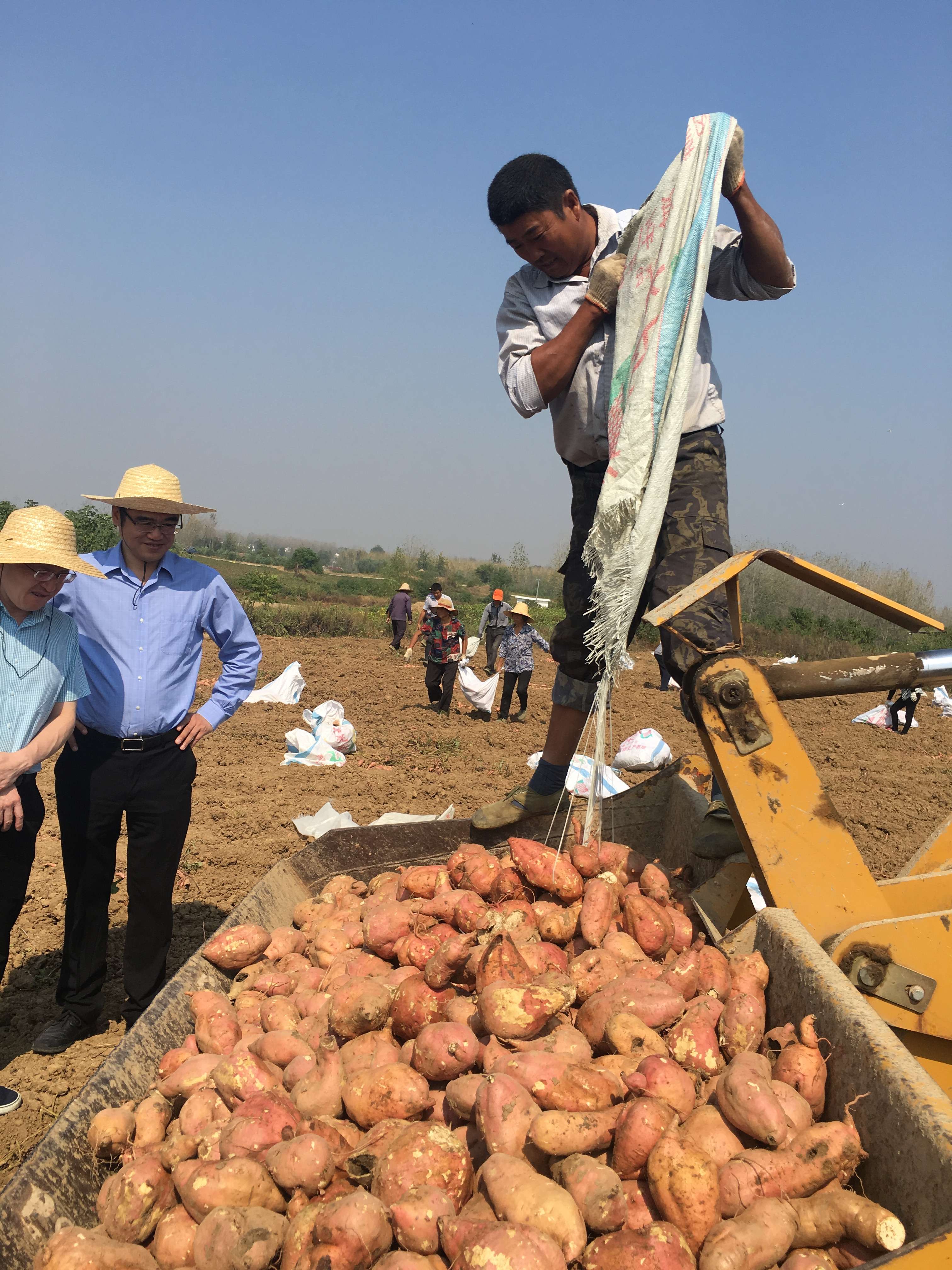 《脫貧紅薯豐收了》-國貿本部-李明輝,2019年9月29日,攝于霍邱縣馮瓴鄉花墻村。該村過去是省級貧困村,2016年安徽國貿及安糧集團聯手對該村實施產業扶貧,引進適合出口的紅薯品種種植,優先吸收貧困戶勞動力前來務工。現該村順利脫貧,紅薯出口到日本、韓國等國家,并加工成多種食品,進入千家萬戶。